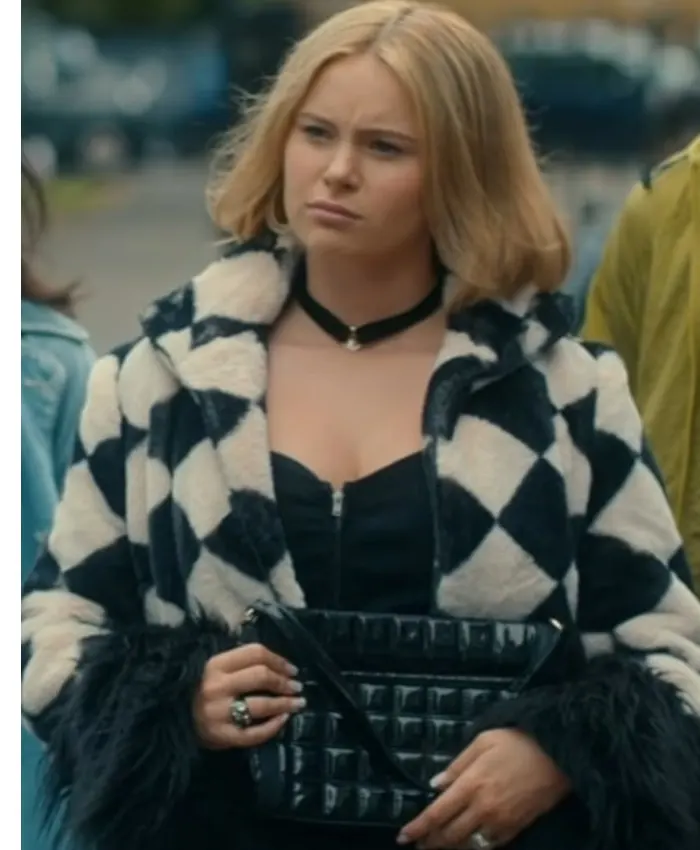 The pattern is a way to feel fashion alive, and Geek Girl 2024 Mia Jenkins caught the fur jacket completely. Well, this TV series is also worn by Lexi in Geek Girl. This black and white checker piece converts a simple outerwear option into a bold fashion statement. The opposite tones create a striking design that mixes fickleness with elegance. Also, making it an eye-catching option for anyone who loves to stay on trend.