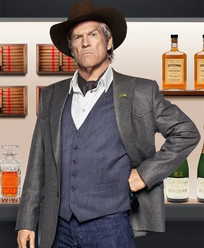 Agent Champagne Kingsman’s grey jacket wore by the American Actor, singer, producer, and composer Jeffrey Leon Bridges. Champ is the leader of Statesman. After Harry and Eggsy foil Poppy’s plans, Champagne purchases a Scottish distillery, effectively helping Kingsman rehab by bringing the organization into the liquor business.