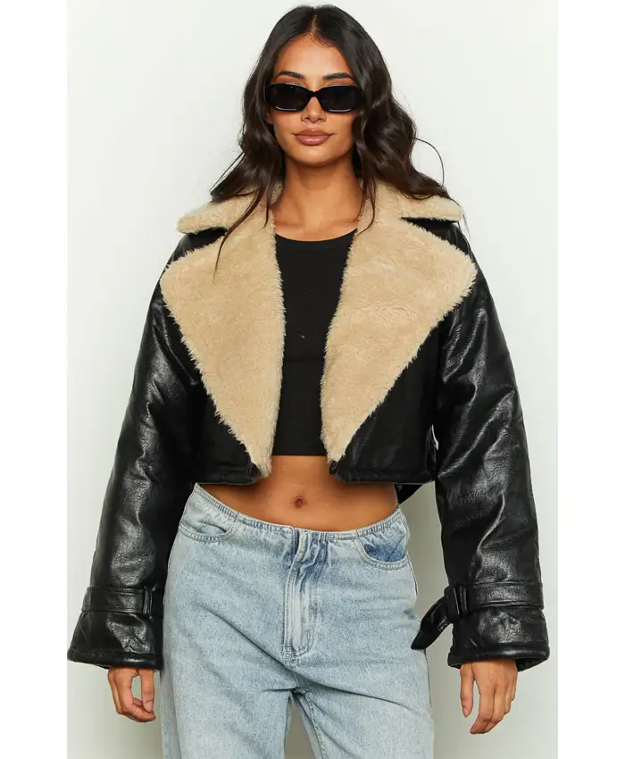 Lioness Off-Duty Cropped Black Leather Shearling Jacket For Women