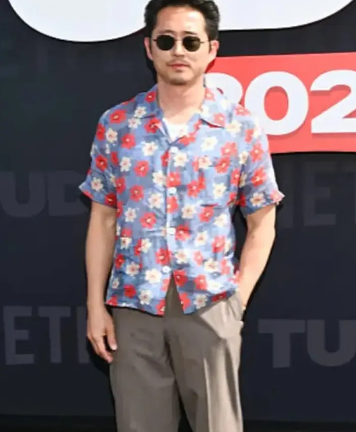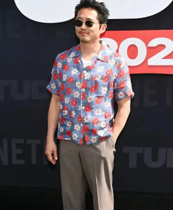 Steven Yeun Netflix Tudum 2025 Blue Floral Shirt