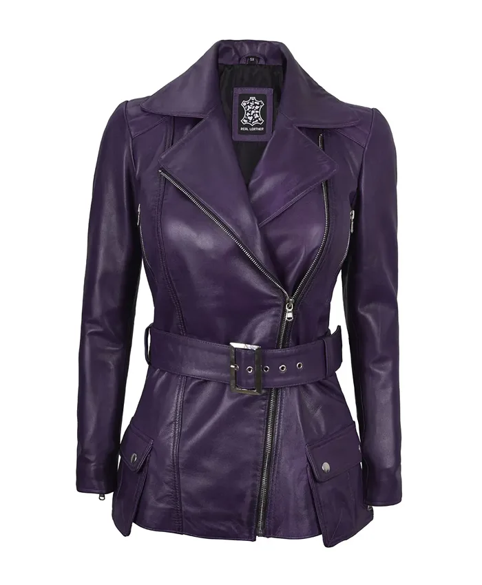 The Totten Womens Asymmetrical Purple Belted Leather Jacket For Sale addresses. This issue is addressed by combining durable real leather with a soft viscose lining. Well, the real leather ensures that the jacket is made in a position to stand well. The cooler provides adequate protection during the evening. While the internal lining adds a touch of comfort that prevents the jacket from feeling extremely rigid. In addition, this balance makes it versatile enough to wear in transitional weather. Where neither heavy winter coats nor light layers look appropriate.