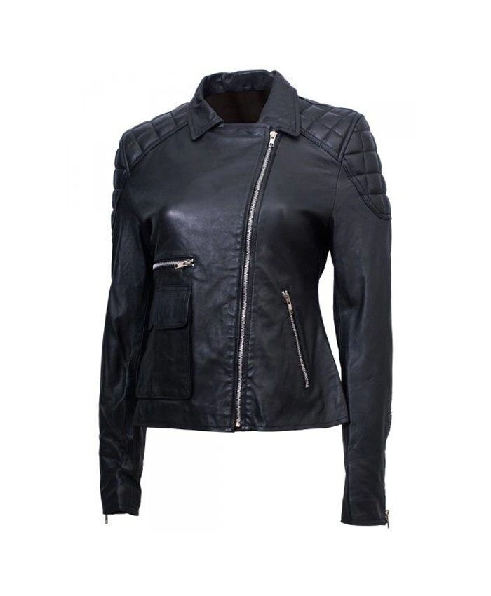 Women’s Black Quilted Shoulder Sheepskin Leather Jacket With YKK Zipper Closure